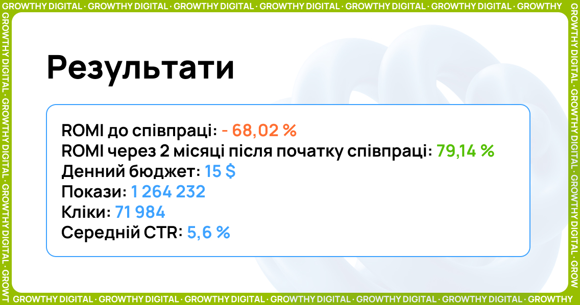 Нашим ключовим завданням був вихід в позитивний ROMI. На початку співпраці ROMI був ― 68,02 %; а очікуваним результатом мало стати збільшення кількості продажів та зменшення ціни продажів. Працювали ми з доволі обмеженим бюджетом ― бл. 15 $/день.