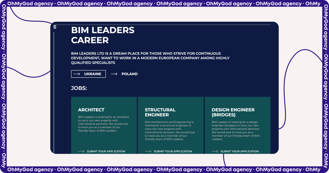 Також для клієнта було важливо, щоб сайт був привабливим для нових потенційних співробітників, тому ми продумали цікаву структуру для розділу «Карʼєра». Ось як він виглядає: