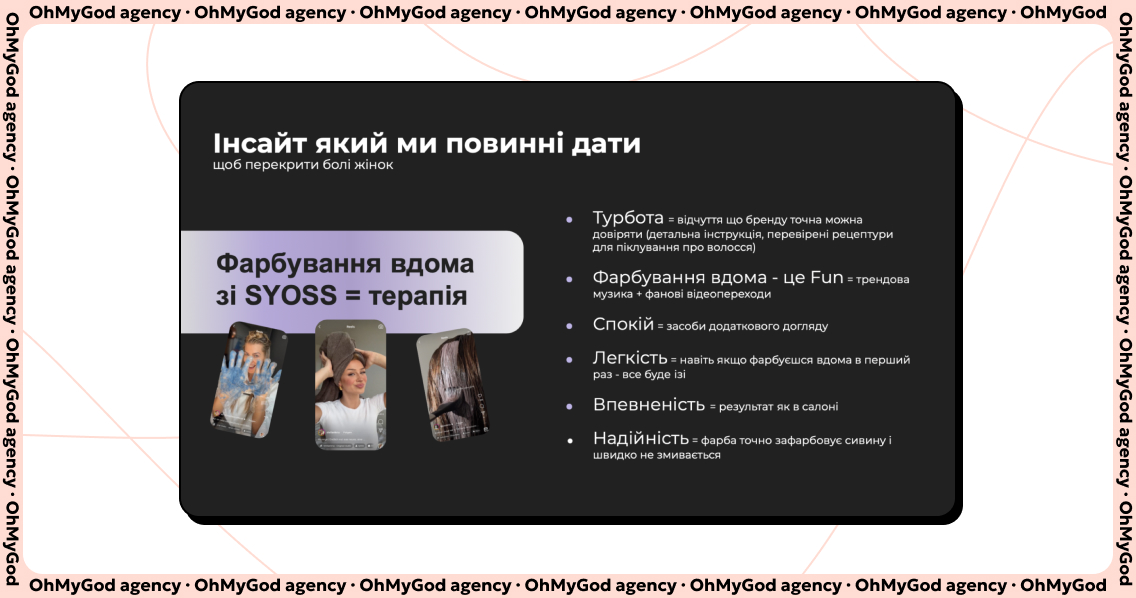 Syoss — справді якісний інноваційний продукт, тож ми мали правильно розповісти про це авдиторії. Визначивши ключові болі ЦА, ми окреслили шість головних інсайтів, які б мала транслювати реклама у блогерів.