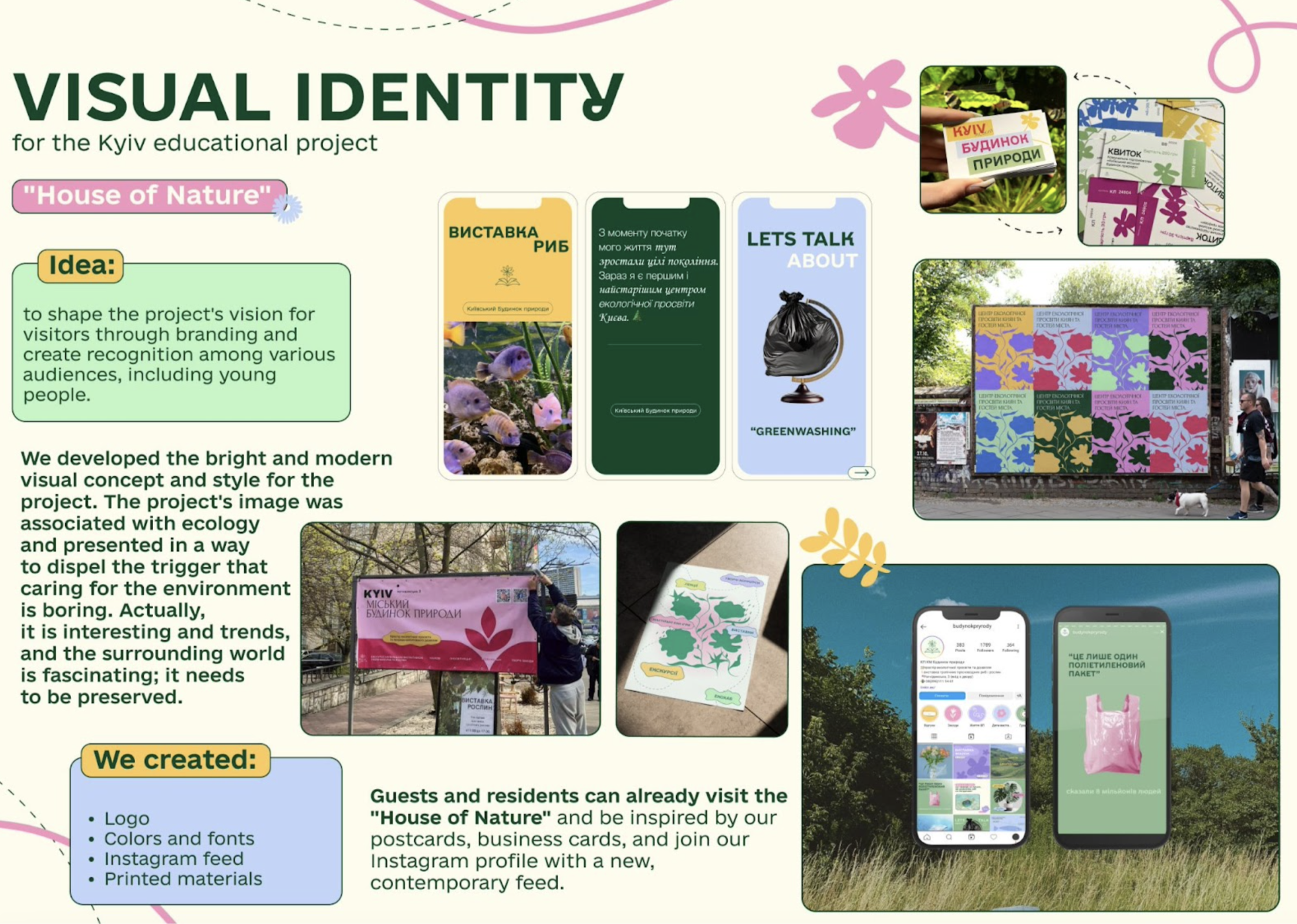 Завдяки нашій роботі «Будинок природи» став більш сучасним і привабливим для відвідувачів, а також зміг підкреслити важливість екологічних тем через яскравий та динамічний дизайн. Гості можуть насолоджуватися новим візуальним оформленням у друкованих матеріалах і приєднатися до нас в Instagram, де представлена нова концепція, що відображає всю енергетику й натхнення нашого проєкту.