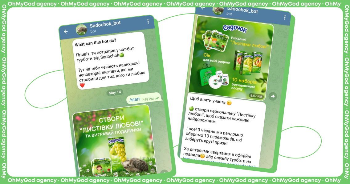 Свою листівку можна було згенерувати й підписати в боті. Крім того, кожен, хто згенерував листівку, автоматично ставав учасником розіграшу від бренду «Садочок».