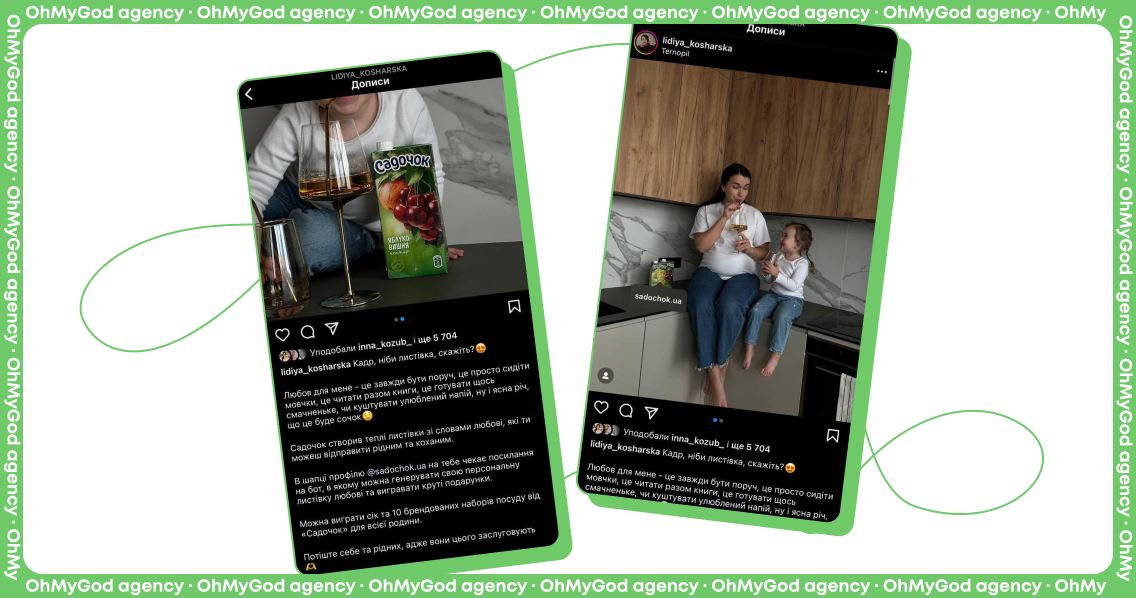 В інфлюенс-кампанії нам треба було донести, що «Словник любові» — це насамперед емоційна концепція, яка має приносити радість, викликати усмішку й дарувати тепло. Тому ми прагнули, щоб інтеграції в блогерів вийшли нативними: блогери розповідали, що для них любов, як вони її виражають, робили ніжний і турботливий контент зі своїми дітьми та лагідно інтегрували сік «Садочок».