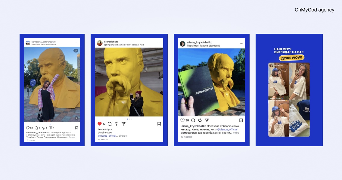 Загалом активація принесла понад 200 згадок в сториз та дописах. І варто зазначити, що це омайгадний результат, адже участь в ній потребувала відчутних фізичних зусиль: відвідати столичний парк чи виставку Ukraine WOW, знайти інсталяцію, створити контент і сформулювати власне бажання.
