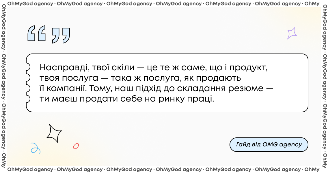 Маркетинг — уже одразу пропонуєш/адаптуєш цей матеріал/досвід для компанії. Це також демонструє, що ти не бездумно відправив шаблончик із ворк.юа, а вивчив запит роботодавця. Великий + в карму майбутньої роботи мрії!