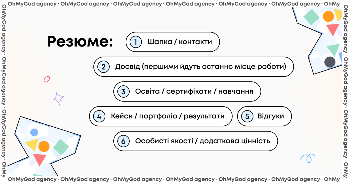 ! важливо! у твій маркетинг входять також: посилання на соцмережі (активна/сучасна людина), можливо вказання гобі чи сфери інтересів (але тільки, якщо вона релевантна/дотична до твоєї професії.